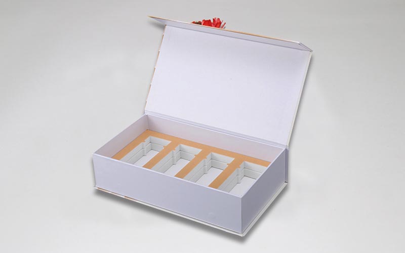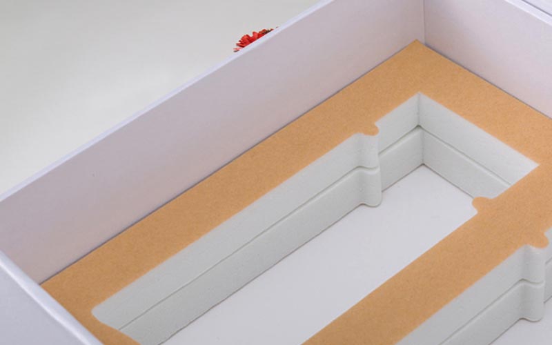 1.材質:盒子面紙用白色珠光紙,彩色印刷,裱1500G雙灰闆 ,盒子内托用白色EVA植絨橘色 。盒子制作比較簡單,翻蓋盒,機器自動話制作。