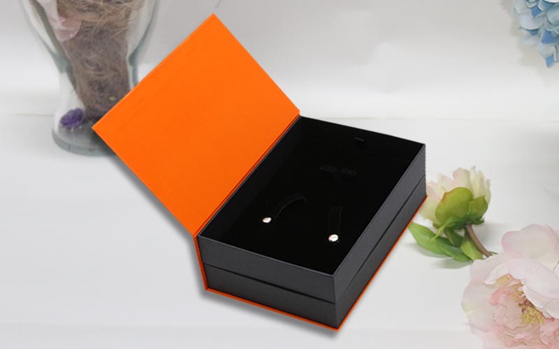 1.材質: 盒子面紙採用157G銅版紙專色印刷 ,LOGO文字燙黑金,雙層的盒子用黑色特種紙裱1300G雙灰闆,内托用黑色植絨的EVA固定産品。整款盒子都是手工制作。
