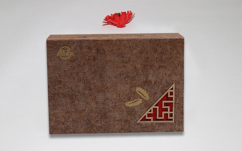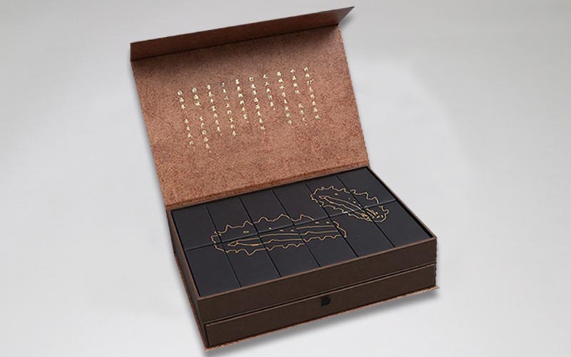 1.質材:盒子用棕色特種紙表面圖标燙金,擊凸,右下角貼镂空貼内襯紙外粘三角新木框。裱1500G雙灰闆,盒子盒型爲雙層抽屜,内托用黑色内卡紙做成小卡盒裏面裝重要産品。盒子粘黑色絲帶整款盒子手工制作。