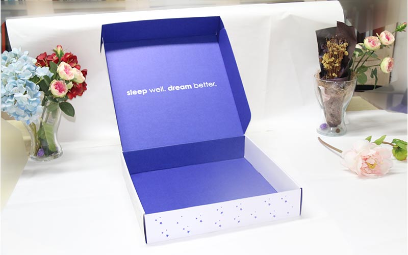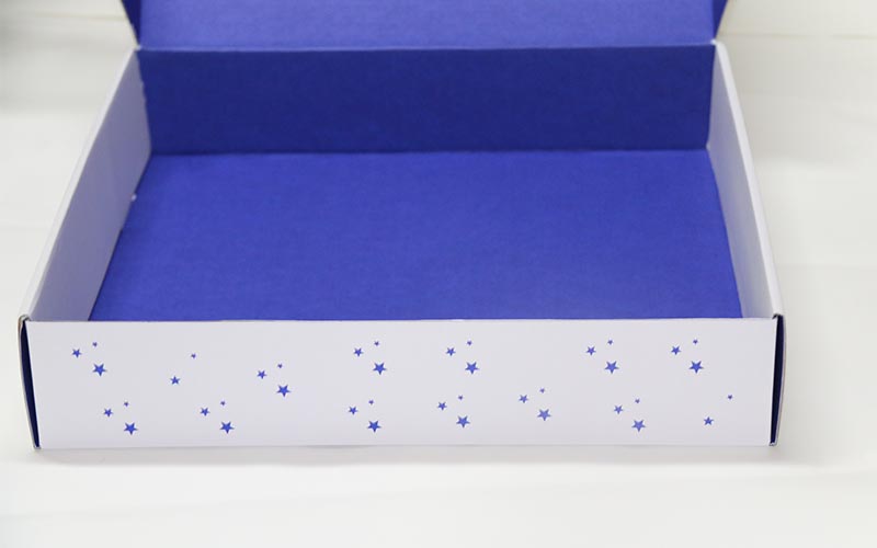 1.材質:盒子有兩個面,正面白色的坑紙直接印刷,盒子打開裏面專藍色印刷,坑紙爲WF細坑加強芯,盒型爲飛機盒,最适合服裝的盒子 。