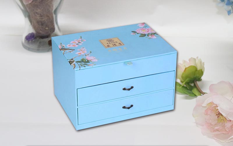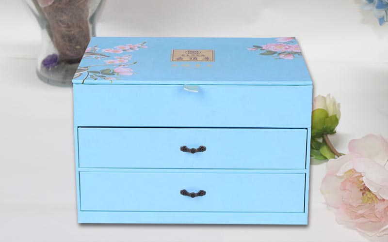 1.材質:盒子面紙用157G銅版紙,單面彩色印刷,過觸感膜 ,裱1800G雙灰闆,盒子結構爲翻蓋抽屜盒,兩層抽屜盒裝複古的手拉扣,盒子裏面也是用一樣的材質工藝,整款盒子結構複雜都是手工制作。