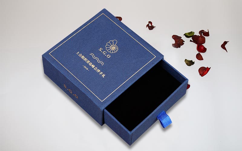 1.材質:盒子面紙採用小石頭紋的藍色特種紙,盒子表面文字LOGO燙金色,裱1200G單白闆,整體盒子爲抽屜盒性,抽拉的地方裝藍色的絲帶。整款盒子手工制作。