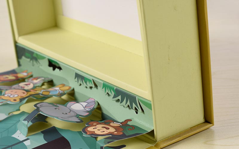 1.材質 :盒子材質用157G銅版紙單面彩色印刷 ,單面覆亞膜,裱1500G雙灰闆,内托用350G單粉卡紙印刷裱350G單粉卡紙,裱内襯在襯紙上貼一張啤好模型立體的動物卡片 ,手工粘好定位,整款盒子手工制作成品。