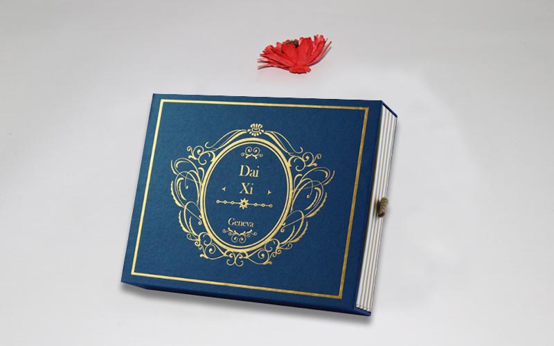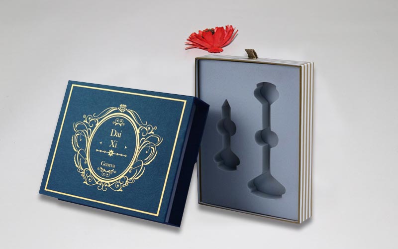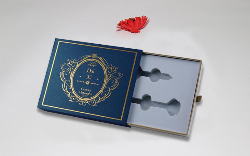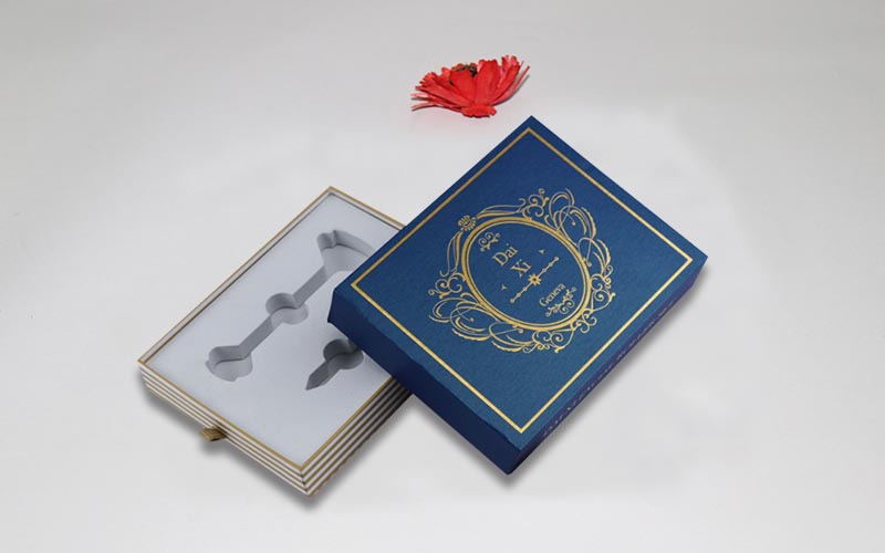 1.材質:外盒子用藍色珠光紋路的特種紙,盒子面紙文案燙黃金,裱1200G雙灰闆,抽盒157G銅版紙彩色印刷啞膜,裱1200G雙灰闆,内托用白色EVA開V槽固定産品。整款盒子機械化制作。