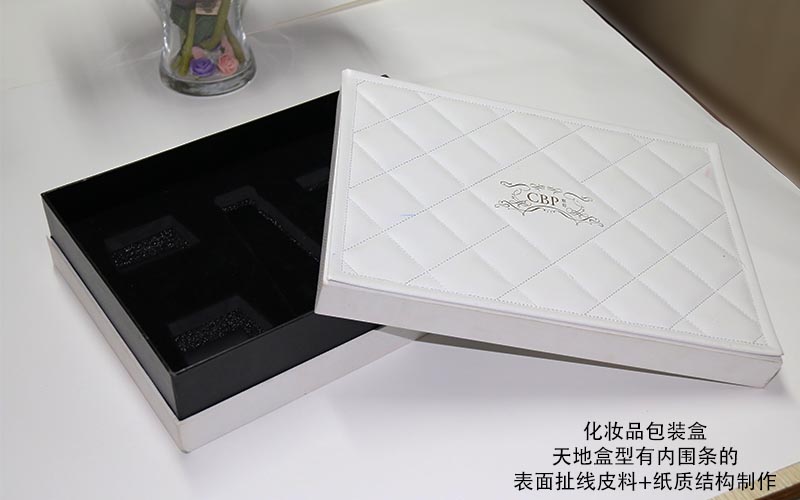 1. 材質:天盒表面扯線白色皮質上面文字LOGO燙金,皮質半成品做好粘在天盒上面,整款盒子都用白色帶(dài)紋路的特種紙手工裱1600G雙灰闆,底盒的内圍條用黑卡紙裱1500G雙灰闆,盒子内部裝EVA植絨(róng)内托,手工制作