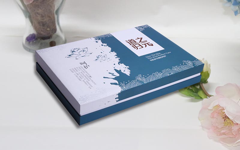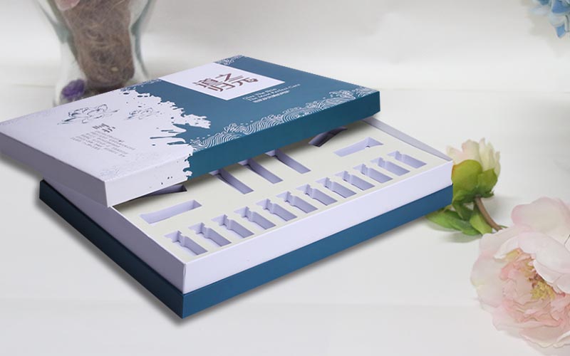 1.材質:盒子面紙採用白色珠光紙彩色印刷,裱1500G雙灰闆,下盒白色珠光紙藍色印刷裱1500G雙灰闆 ,中間純白色珠光紙裱1500G灰闆做圍條。内托用白色EVA,但是最重要的是盒子表面裱一層1MM厚度的海綿,盒子摸起來也會更有手感,整款盒子手工制作。