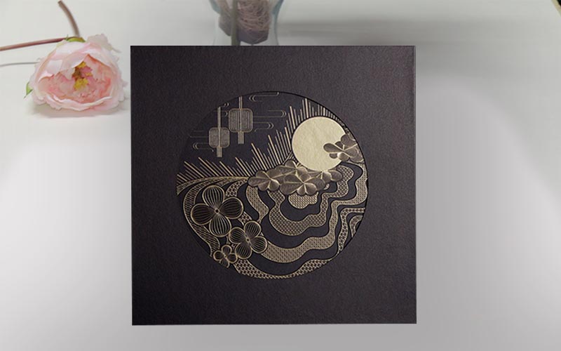 1.材質:.盒子面紙黑色珠光紙表面燙金文字,中間镂空圓形貼黑色特種紙燙金裱1300G灰闆镂空花型,盒子整體裱1500G雙灰闆盒型爲天地盒+内圍條。手工制作手提袋中國紅珠光紙簡單的燙金工藝。