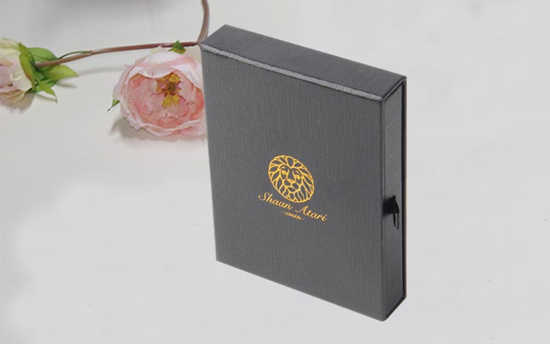 1.材質:盒子面紙用盒子有紋理的特種紙,表面LOGO燙香槟金,裱1300G雙灰闆,盒子内托用黑色EVA植黑色絨,盒型爲抽屜盒裝一個黑色的小絲帶方便抽拉,整款盒子外盒手工制作,内盒上機生産。